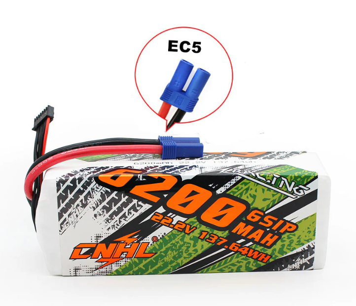A CNHL Racing Series 6200mAh 22.2V 6S 90C Bateria LiPo com Plug EC5 é concebida para condutores e pilotos que querem tanto potência bruta como maior autonomia. Com a sua classificação contínua de 90C, fornece uma forte voltagem sob carga enquanto lhe oferece minutos extra no ar ou no solo.